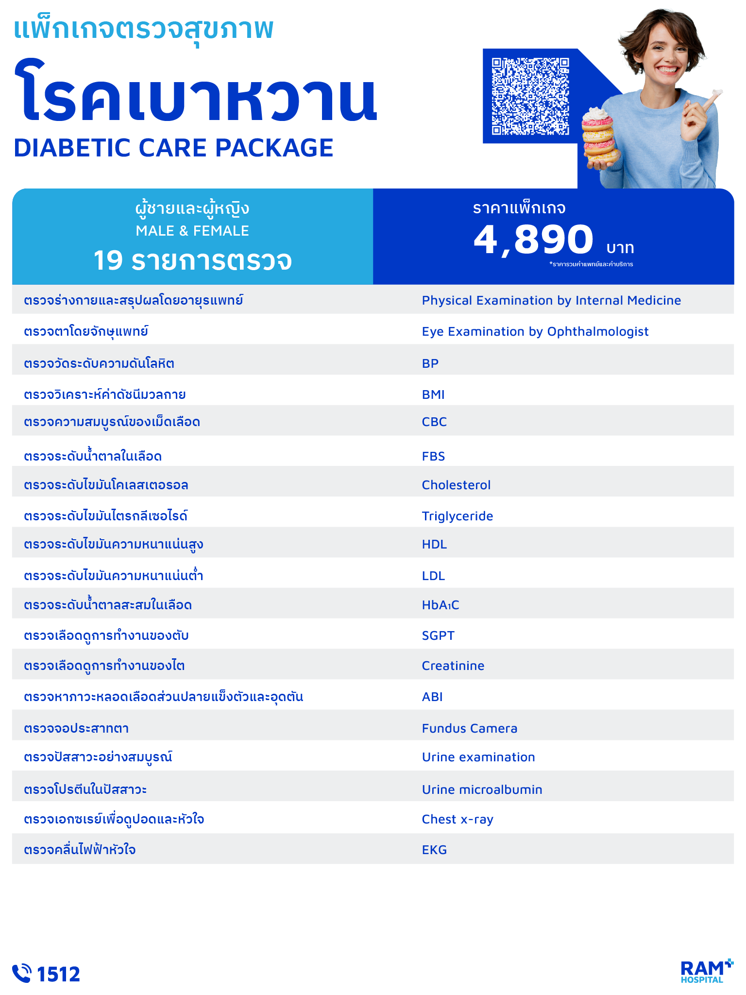 พร้อมใส่ใจและดูแลคุณ เพื่อให้รู้สึกอุ่นใจตลอดการใช้ชีวิตด้วยโปรแกรมตรวจสุขภาพโรคเบาหวาน (Diabetic Care Package) ภายใต้การดูแลของอายุรแพทย์ต่อมไร้ท่อและจักษุแพทย์ที่ชำนาญ ตรวจได้ทั้งชาย-หญิง หรือเพศทางเลือก ตั้งแต่การตรวจความสมบูรณ์ของเม็ดเลือด ภาวะเลือดแข็งตัวหรืออุดตัน การตรวจคลื่นไฟฟ้าหัวใจ และอื่น ๆ
