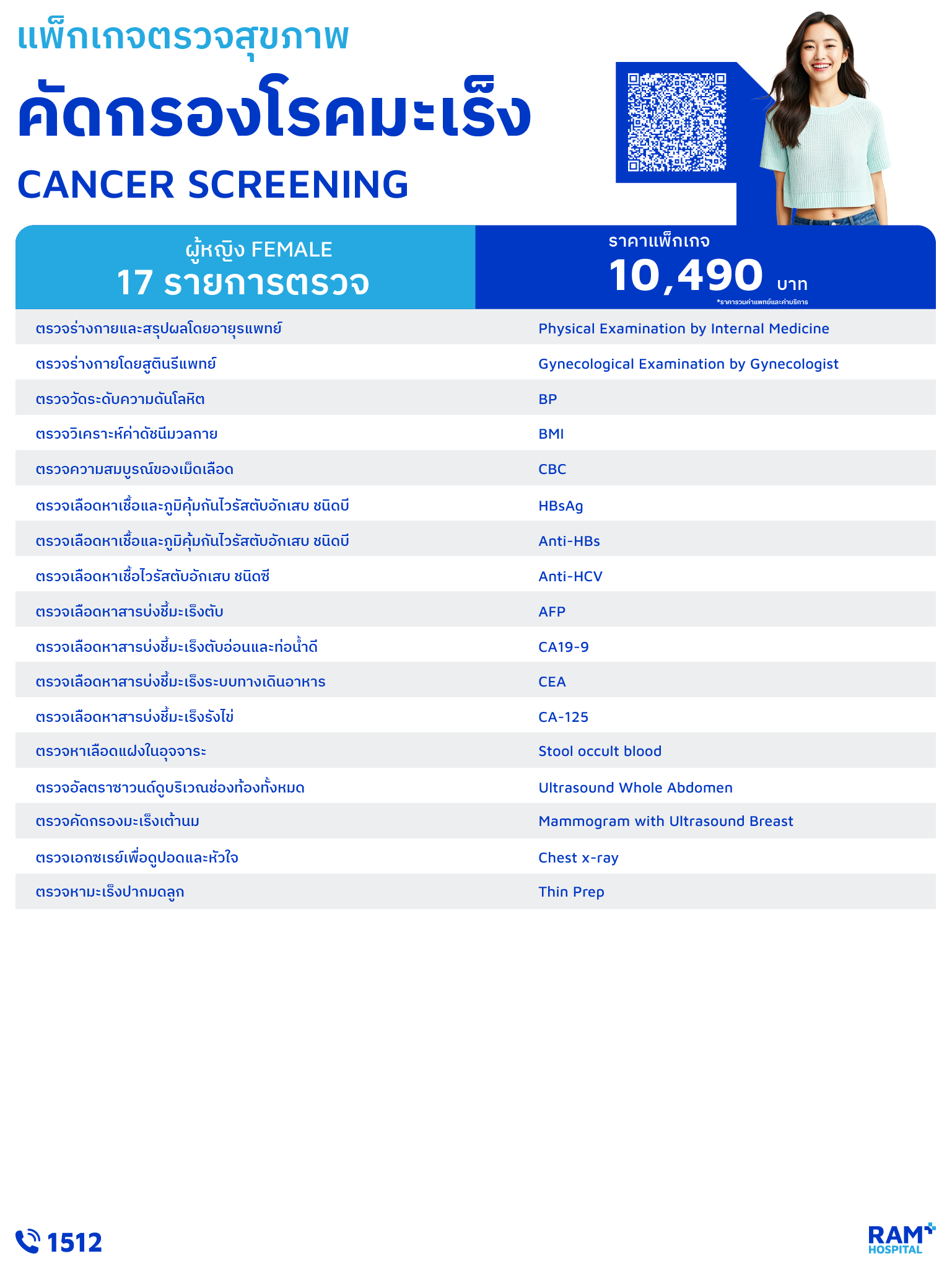 แพ็กเกจตรวจคัดกรองโรคมะเร็ง (ผู้หญิง) การตรวจเลือดความสมบูรณ์เม็ดเลือด (CBC) ตรวจหาไวรับตับอักเสบ ตรวจหาสารบ่งชี้มะเร็งตับ ตรวจเลือดหาสารบ่งชี้มะเร็งตับอ่อนและท่อน้ำดี ตรวจเลือดหาสารบ่งชี้มะเร็งระบบทางเดินอาหาร